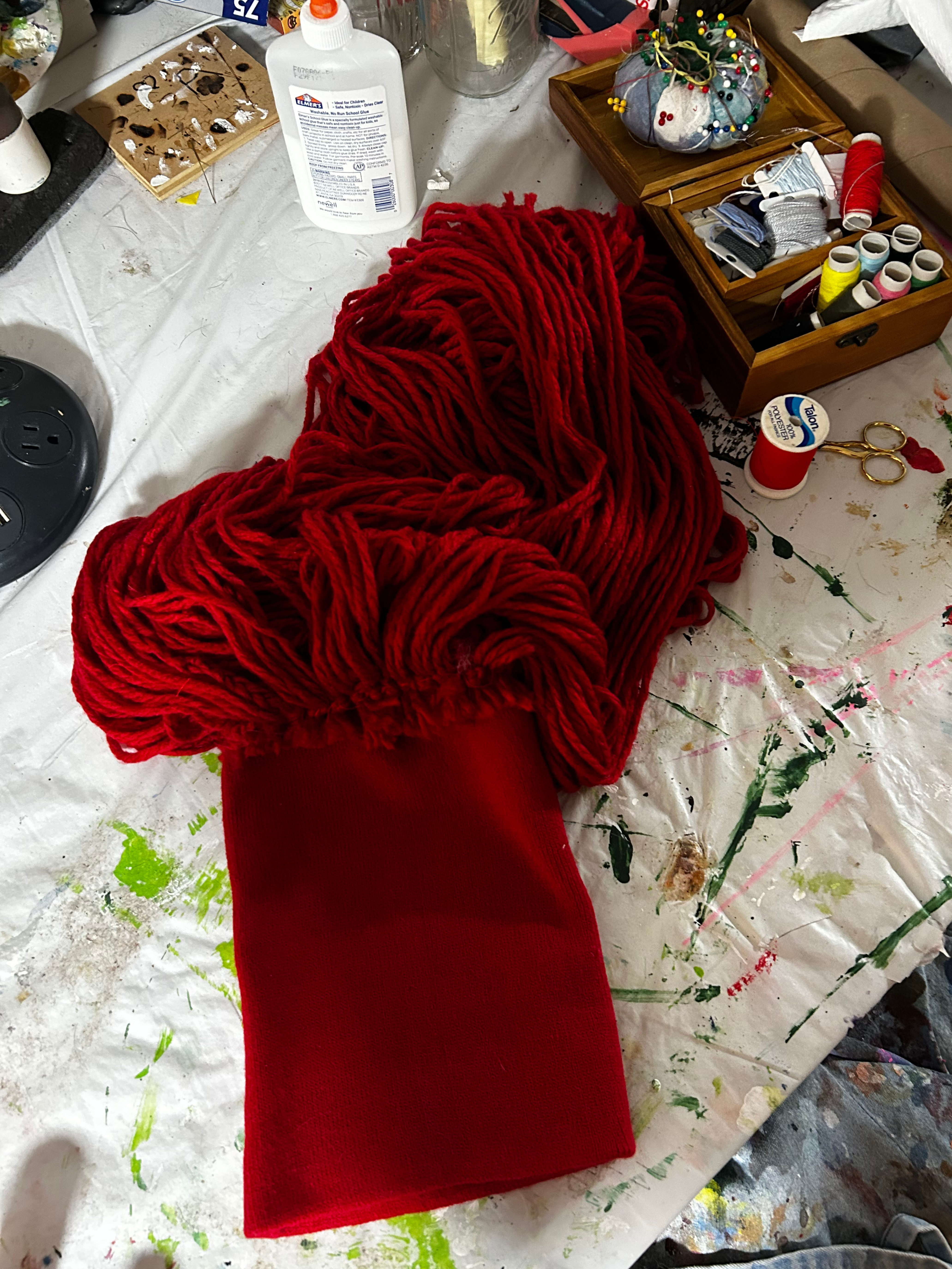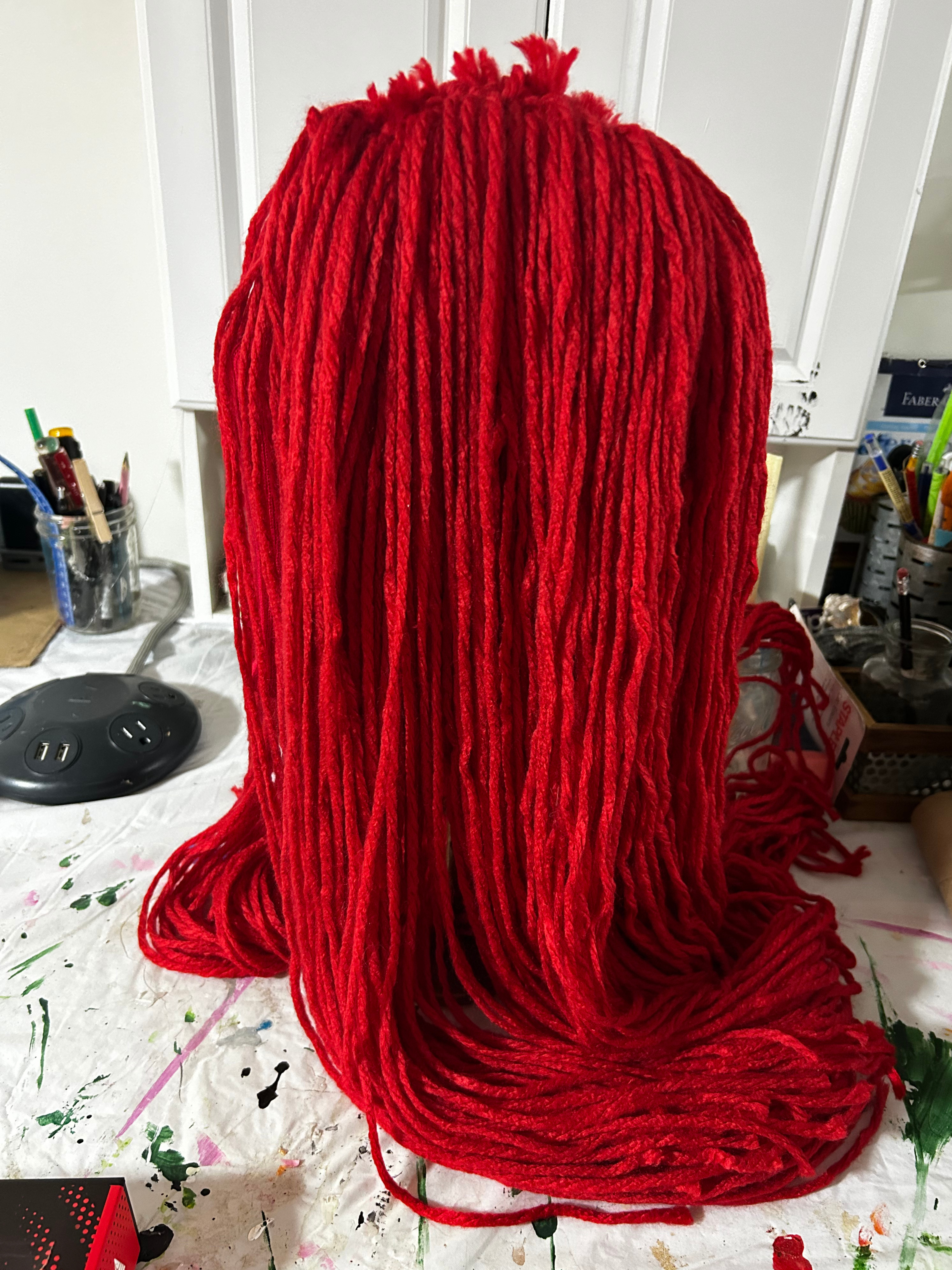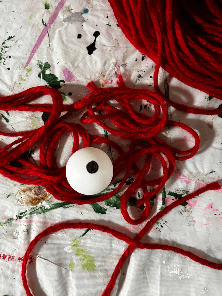 While watching a show together, we grabbed red yarn and cut a LOT of strands to roughly equal length.
